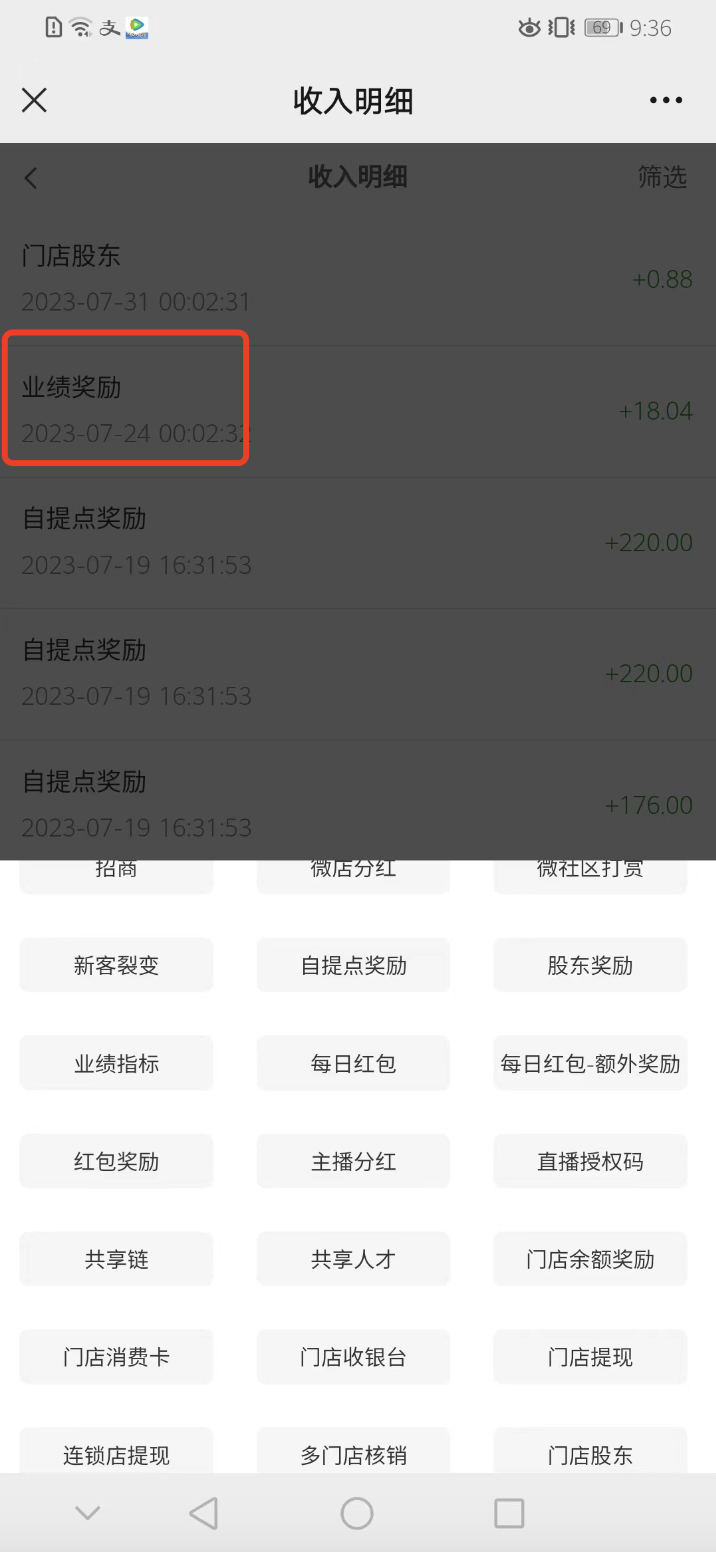 注意:收入明细是记录在数据库里的,中途修改业绩奖励名称,修改之后产生的新收益才会同步名称,原收入还是显示原来的名称。