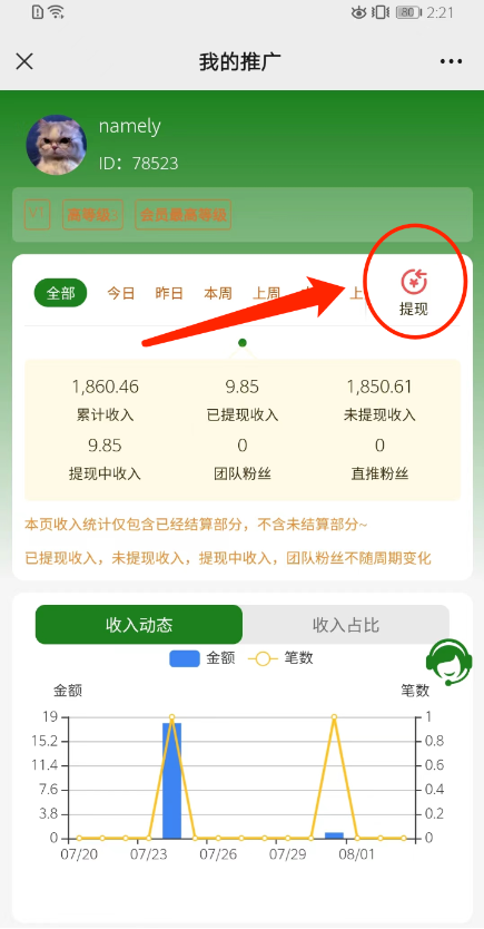 3、在收入提现页面可对奖励进行提现。