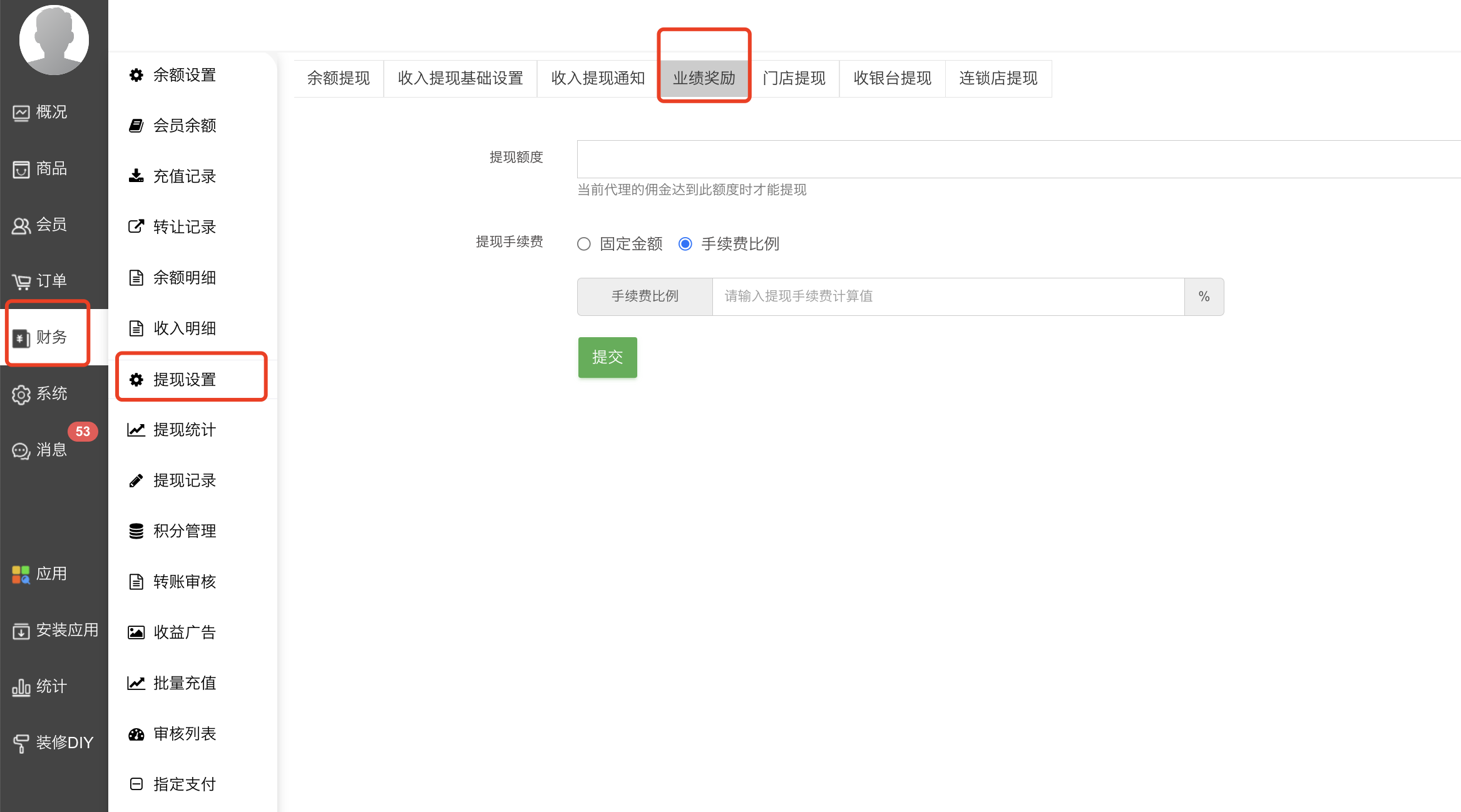 1、财务 -- 提现设置 -- 业绩奖励处设置提现额度、提现手续费