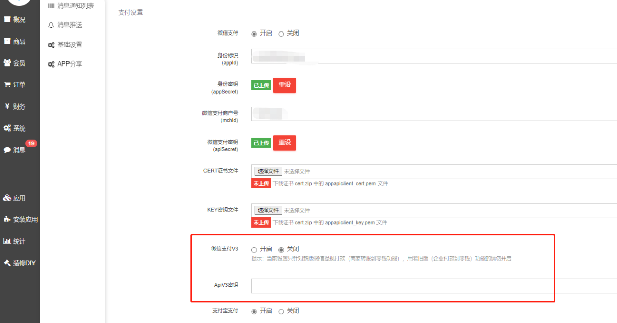 后台小程序设置路径:商城后台 -- 应用中心 -- 小程序 -- 基础设置,开启微信支付-V3新版